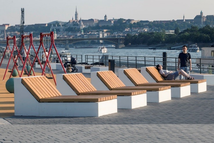 Bänke und Sonnenliegen, Budapest, Ungarn