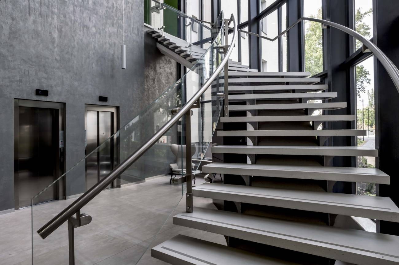 Stilvolle und moderne Betontreppe mit Geländer aus gehärtetem Glas im Bürogebäude Budapest Balance Loft.