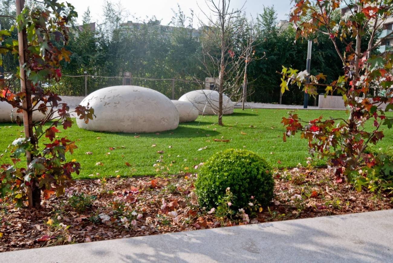 Hingucker und praktisch sind eine spezielle Betonverkleidung und riesige Kieselsteine, die als Betonmöbel fungieren. Der Beton wurde in eine spezielle Kiesform gegossen, und die glatte Oberfläche wird an einigen Stellen durch Blattmuster unterbrochen. Aus der Ferne und aus der Nähe betrachtet ist es ein ganz besonderer Anblick, und dennoch wirkt es umgeben von den umliegenden modernen Gebäuden wie eine Insel der Ruhe.