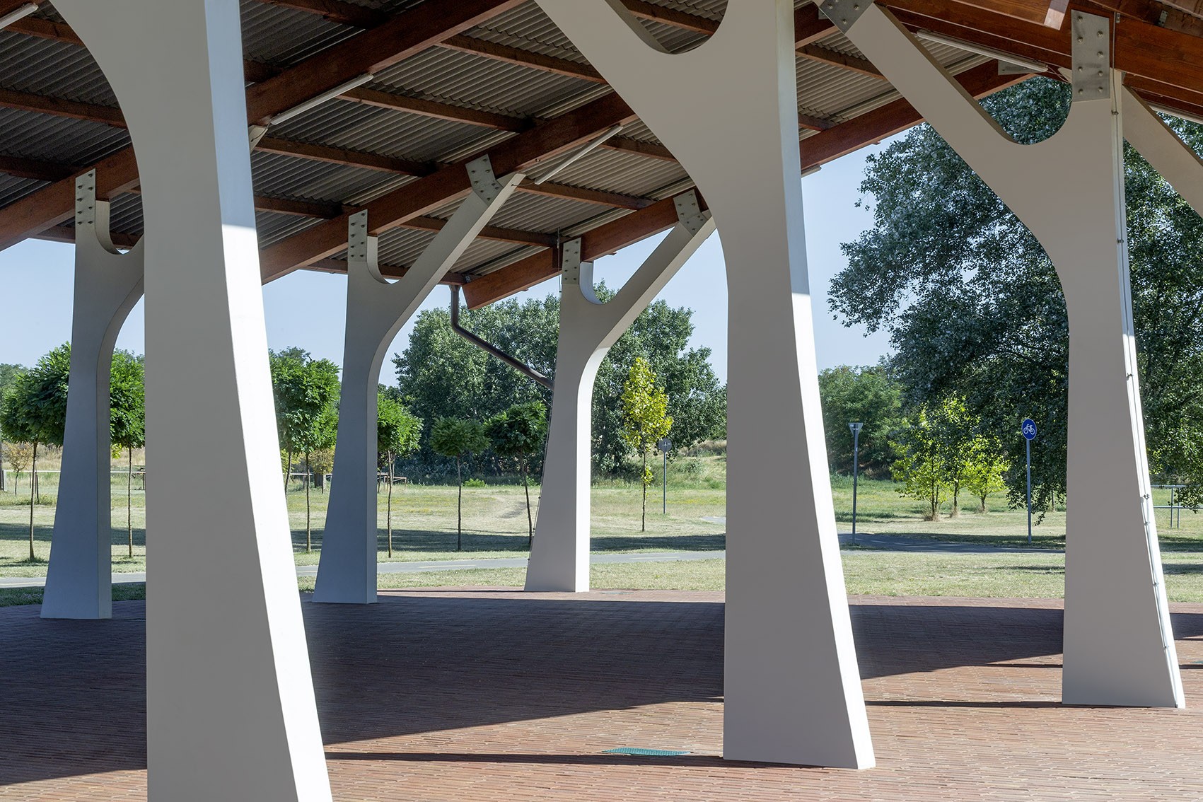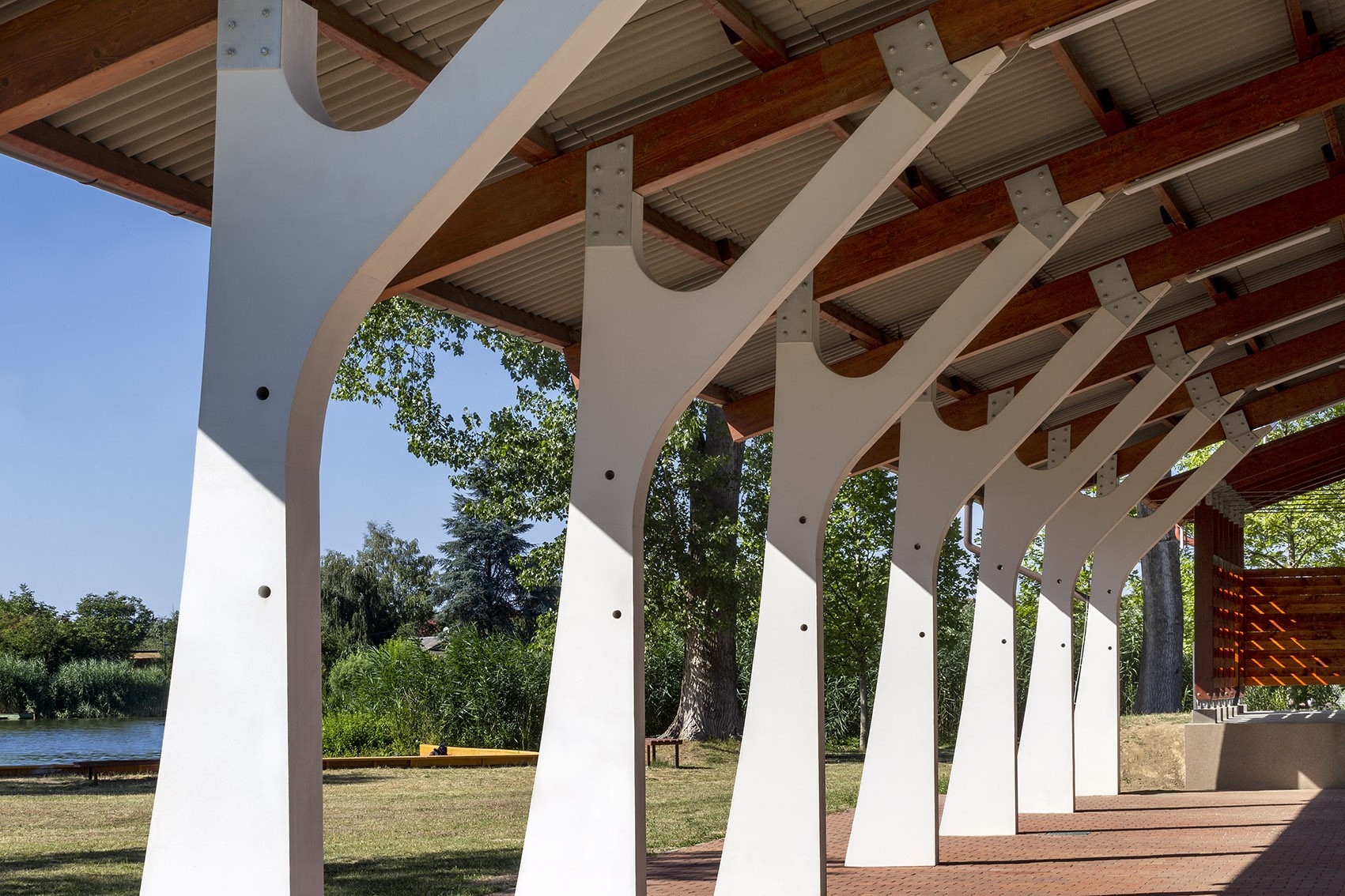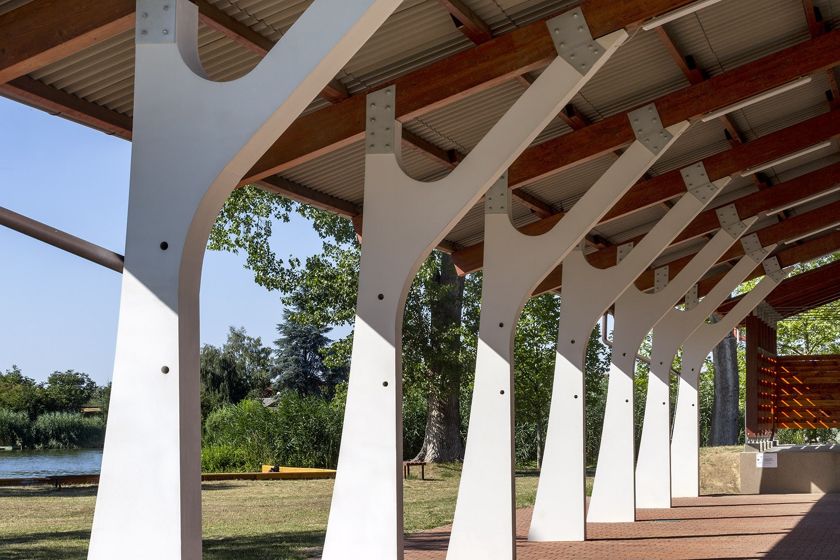 Spektakuläre Stützsäulen aus Beton im Zuschauerraum der Freilichtbühne in Békésszentandra.