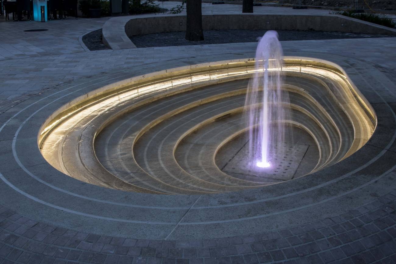 Wasserdichte Betonfertigteilmöbel, Raumelemente. Die imaginäre Welt des Betons kann nur durch Vorstellungskraft und Physik begrenzt werden. Dieser schöne Betonbrunnen ist ein großartiges Beispiel für die Möglichkeiten der Verwendung von Sichtbeton, sogar bei der Dekoration von Gärten und öffentlichen Bereichen.
