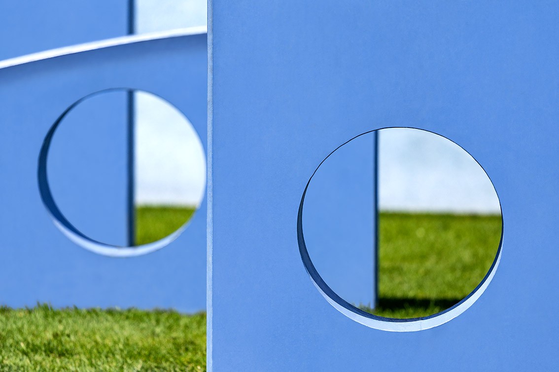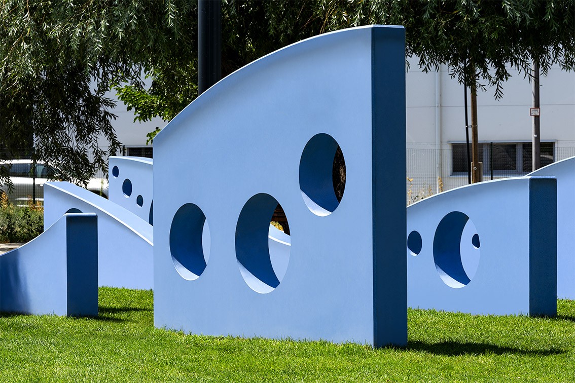 The special, blue visual concrete elements of the leisure park located on Hajó utca in Budapest.