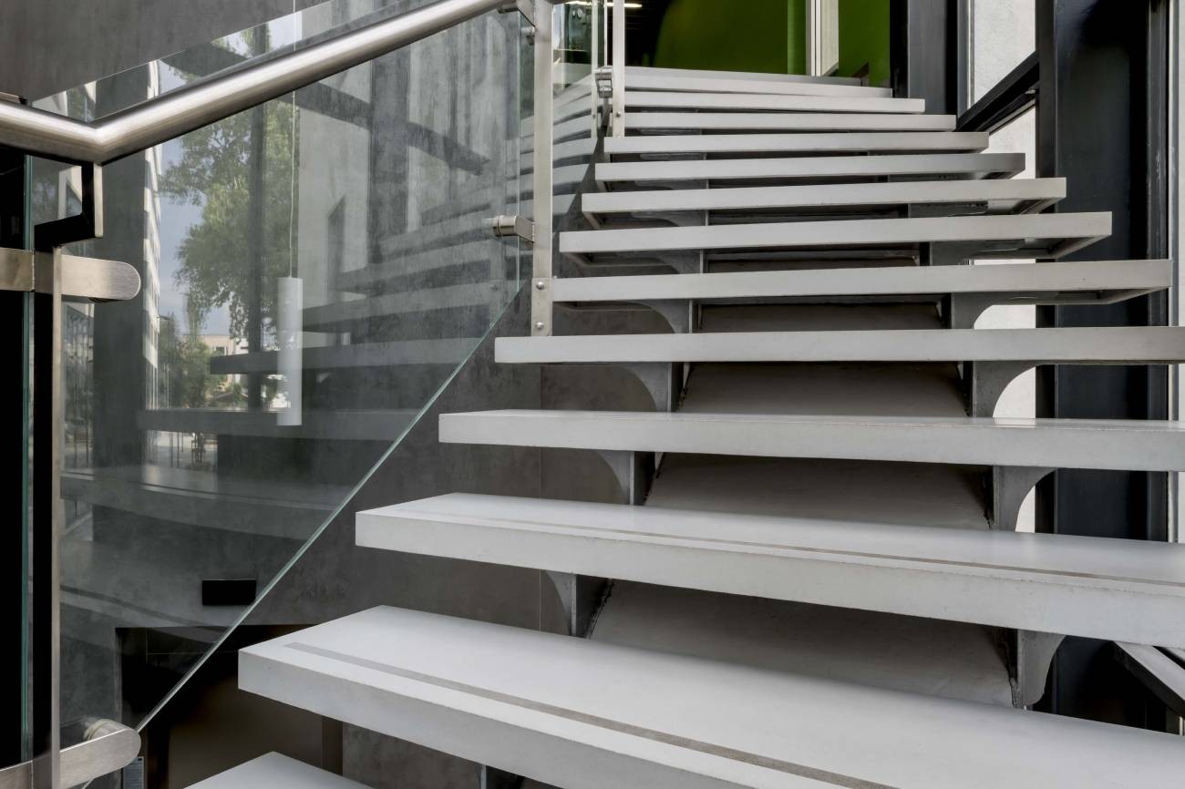 Stílusos és modern betonlépcső edzett üveg korláttal a Budapesti Balance Loft irodaházban.
