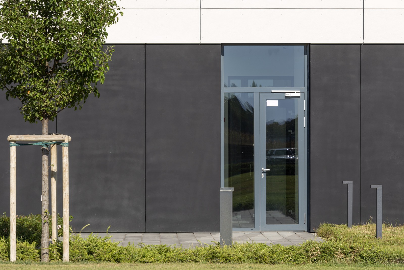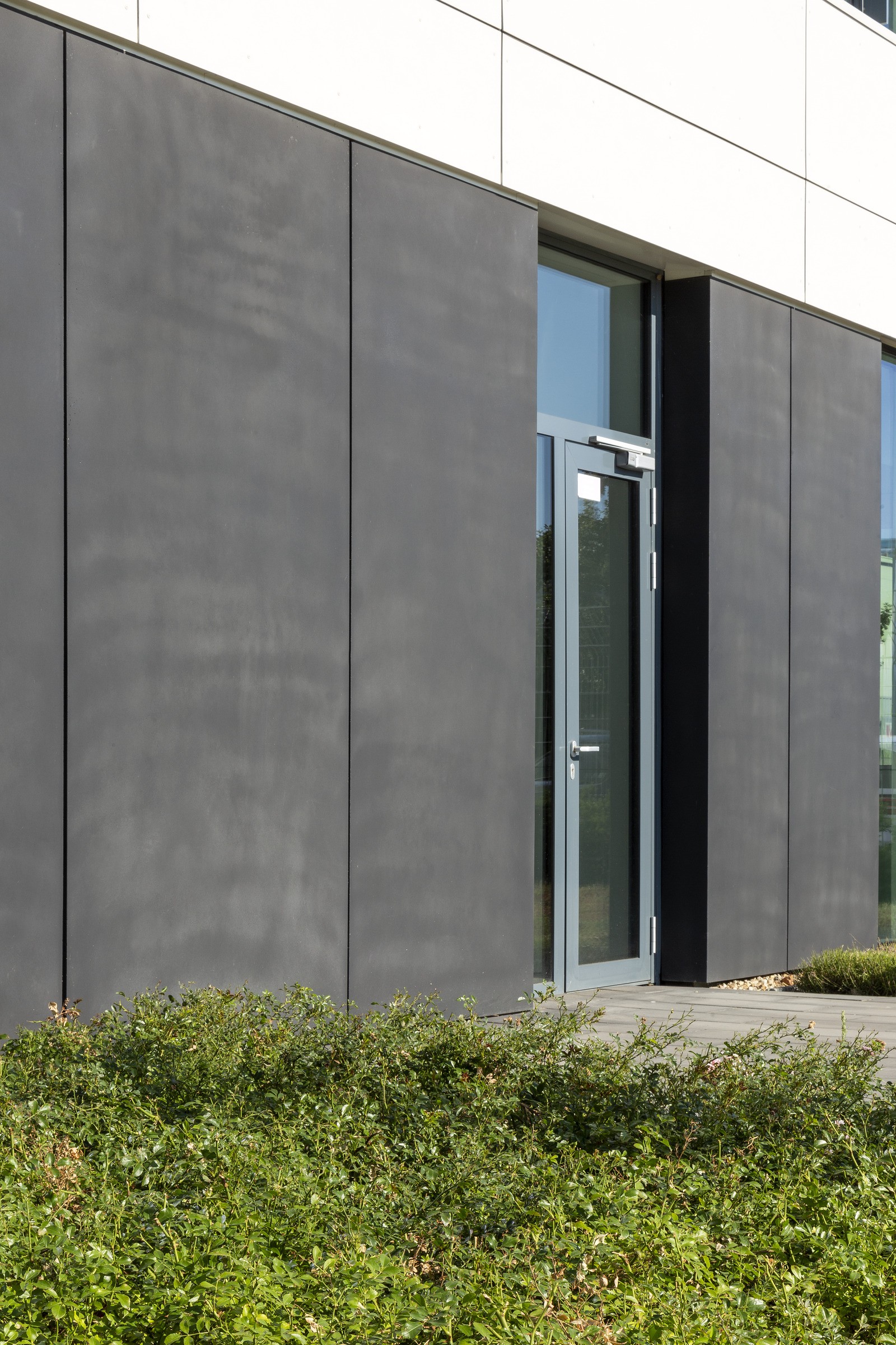 A debreceni Richter Gedeon épületének az alsó szinten lévő, különleges fekete színű Stylecrete homlokzatburkolata.