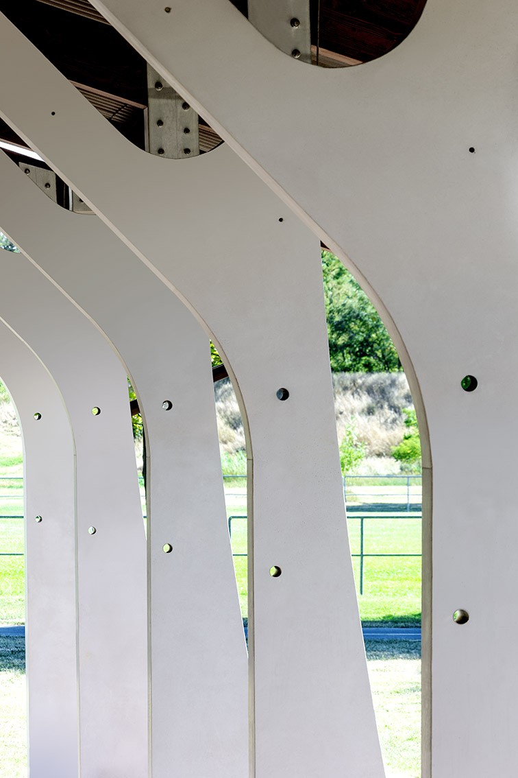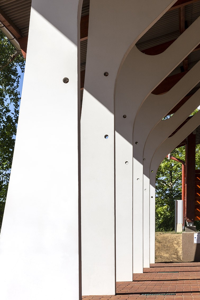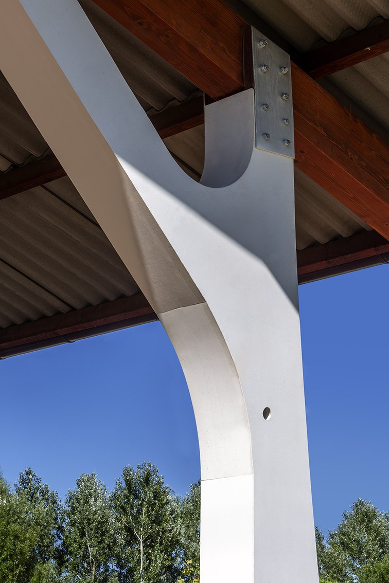 Látványbeton tartóoszlopok a békésszentandrási szabadtéri szinpad nézőterén.